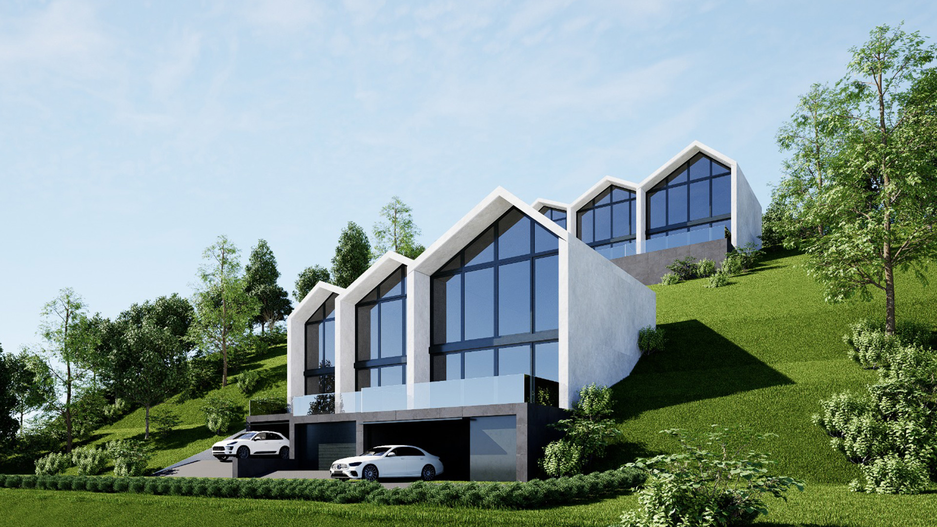 The development comprises six single-family villas positioned on a 3,000 m2 hillside plot. Each residence is designed to integrate naturally into the sloping terrain, allowing every home to enjoy open vistas toward the Alpine landscape while maintaining privacy and a sense of calm.
